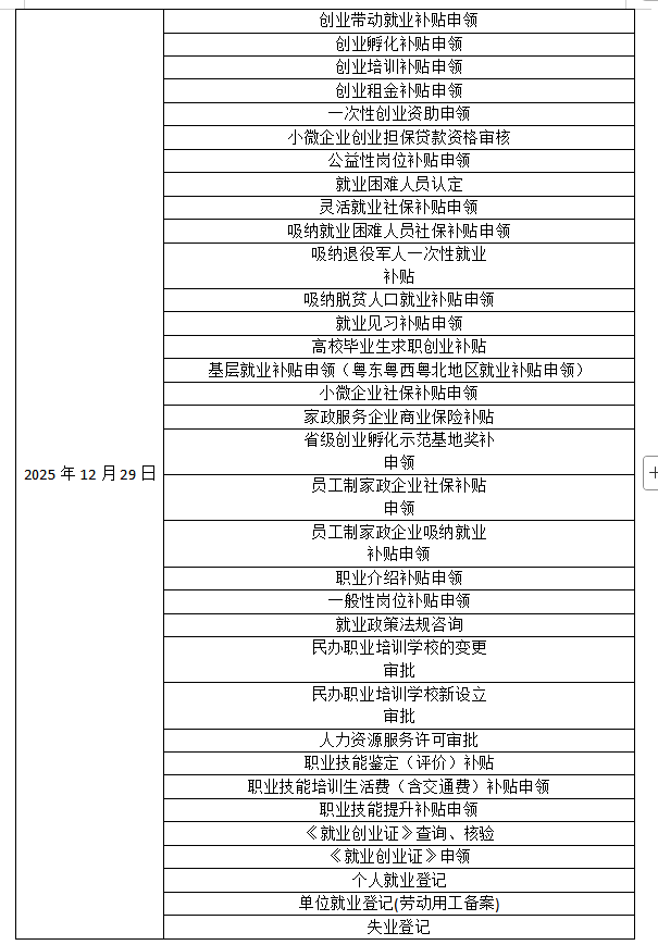 为不断优化营商环境,方便企业和群众办事,自2025年12月22日起,99贵宾会官网 人社局一楼政务服务大厅(99贵宾会官网 99贵宾会 大道北63号)人社业务将逐步迁移至市行政服务中心,人社业务进驻的具体时间见下表。届时,如需办理相关业务,请前往市行政服务中心二楼综合窗口,给您带来的不便,敬请谅解。